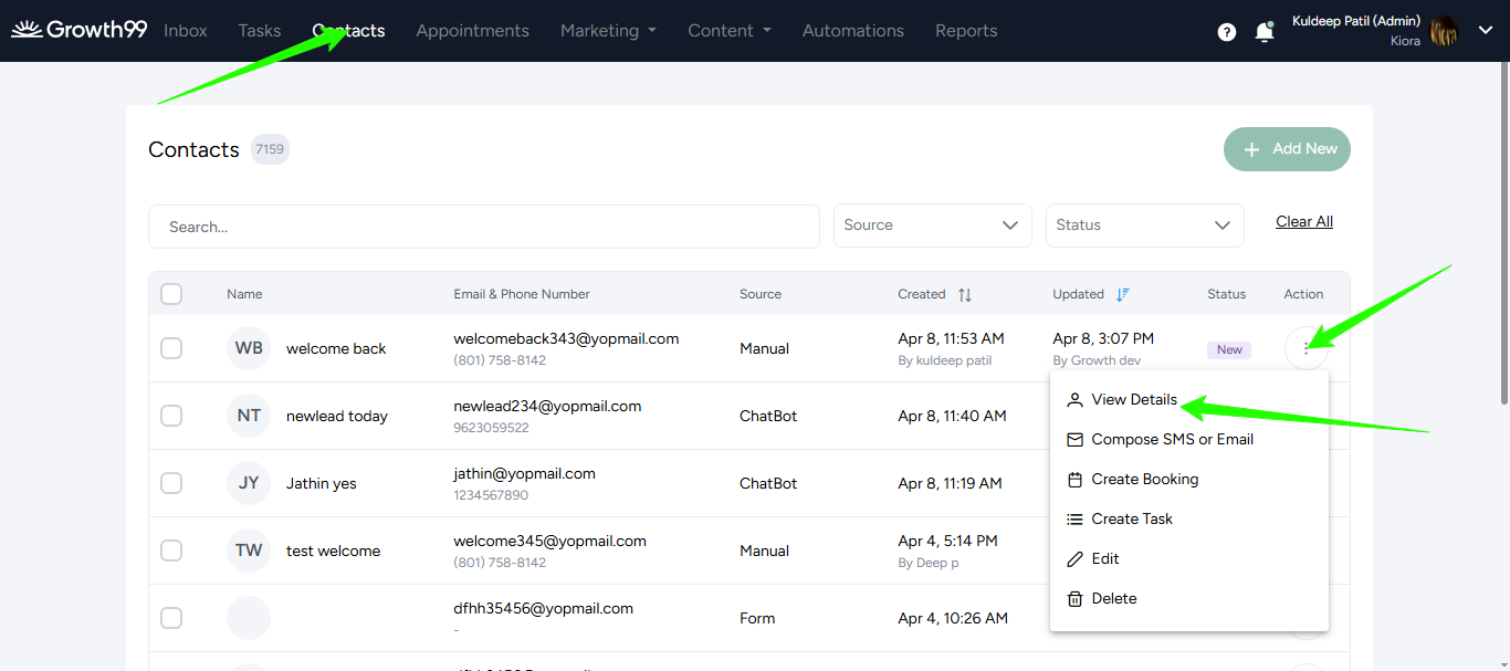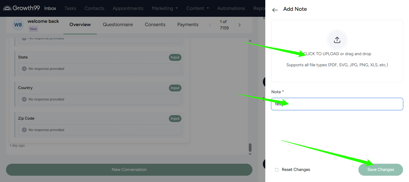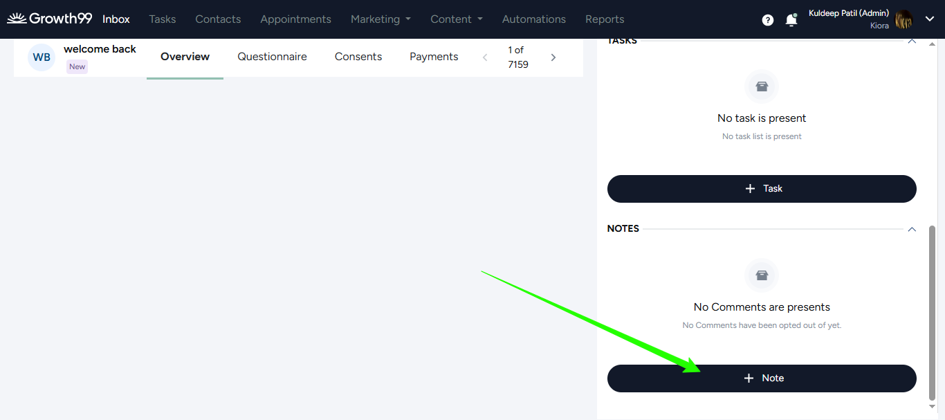 Add notes to a contact in Growth99+. Notes help you track important information, communication history, and reminders for individual contacts. Follow these simple steps to access a contact's detail page and add your notes.