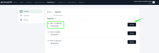 next to the clinic with "Setup Pending" to configure Google Business Profile.