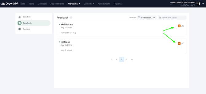 - Users can filter feedback by location or date range using the top-right filters.