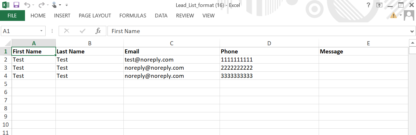 The downloaded file contains dummy data in the first three rows. Delete the first three rows before adding your actual lead data.