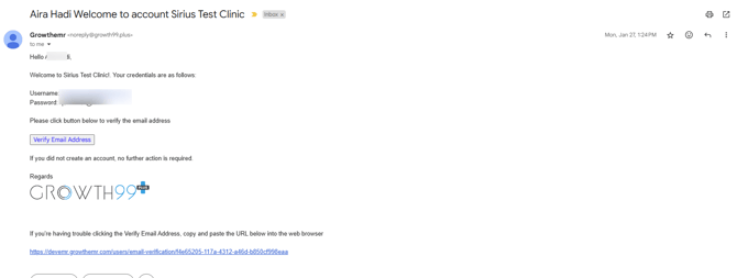 Every new Growth99+ business account user must verify their email address before accessing the full platform features. Email verification is the first step in setting up your clinic and creating your Growth99+ profile.