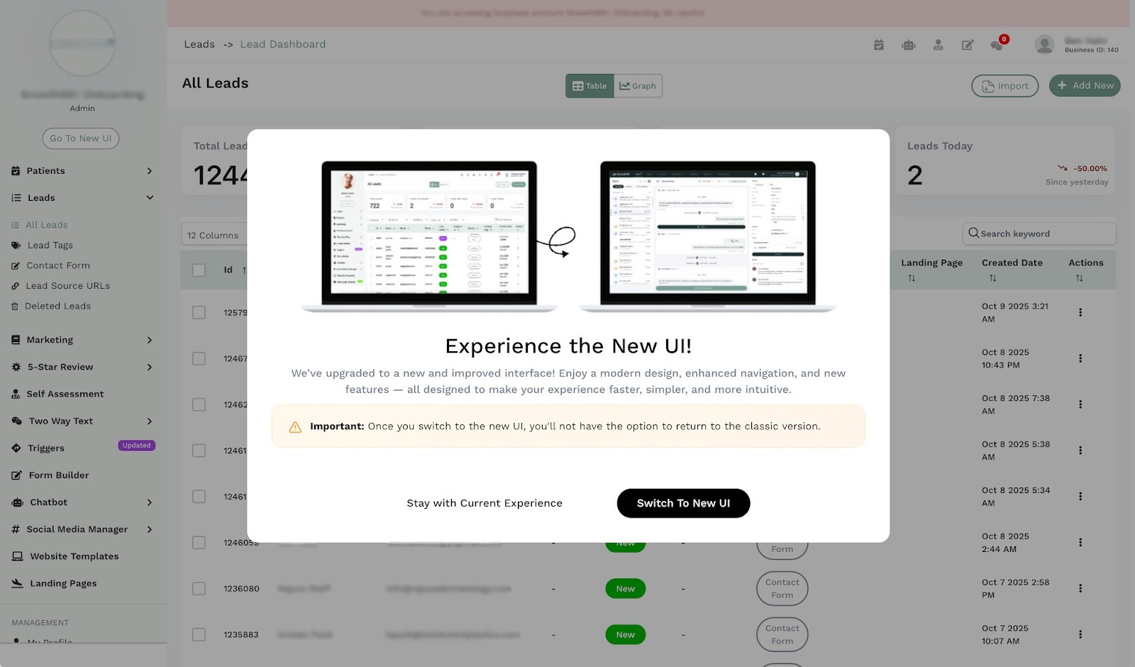 Once you move to the new UI, you will not be able to return to the classic version. Please ensure you're ready to make the switch before clicking the button.